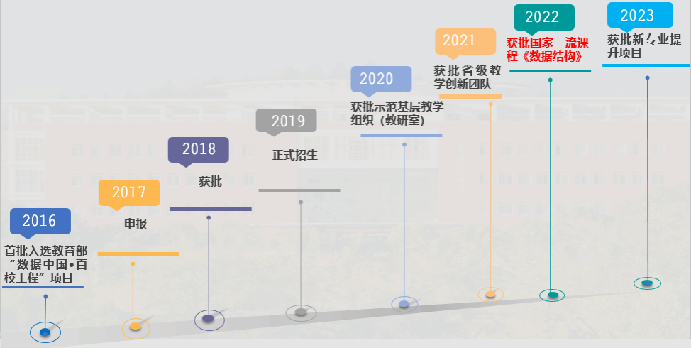yl6809永利官网数据科学与大数据技术专业,2016年首批入选教育部“数据中国•百校工程”项目,2017年开始申报,2018年获批,2019年正式招生。2022年《数据结构》获批第二批国家线上线下混合式一流课程。