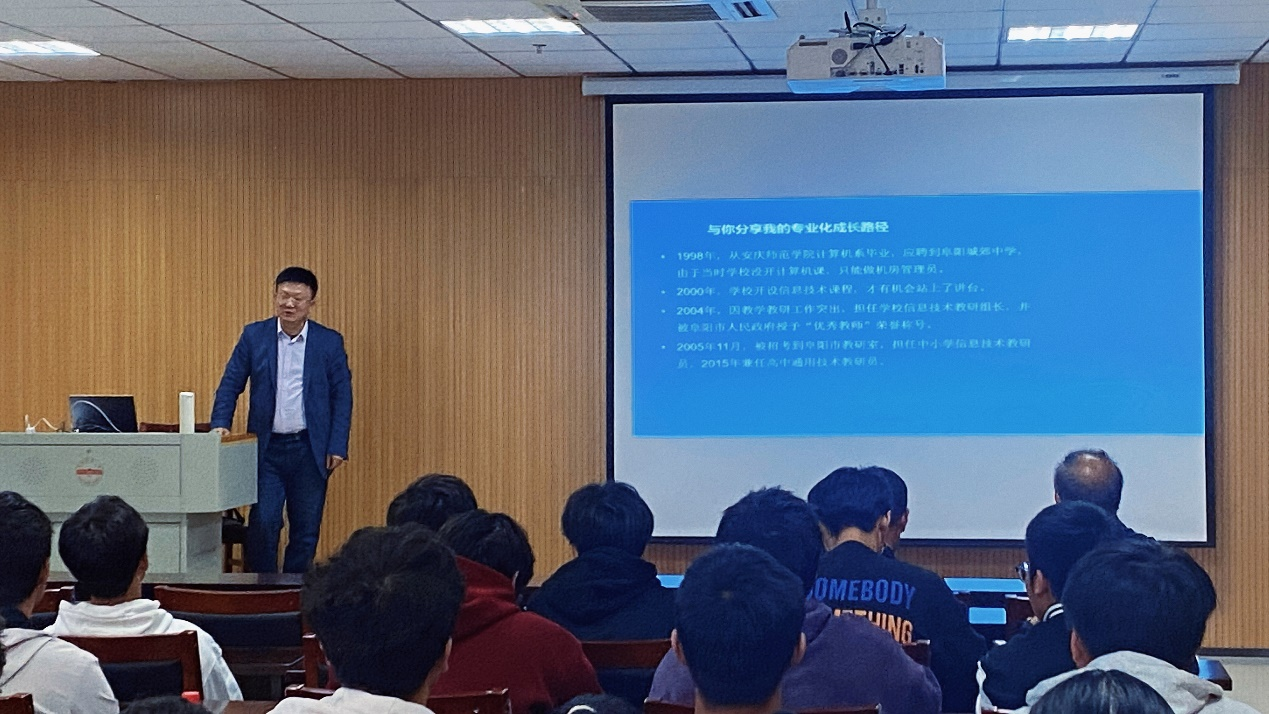 学院特邀阜阳市教育局正高级教师冯士海、中国海洋大学教授汪克亮和安徽大学博士后赵大卫三位优秀校友来校共话前沿科技与职业规划。交流会吸引了一年级研究生和本科生70余人,王一宾教授和程玉胜教授分别主持活动。