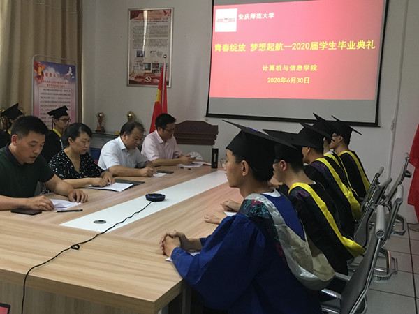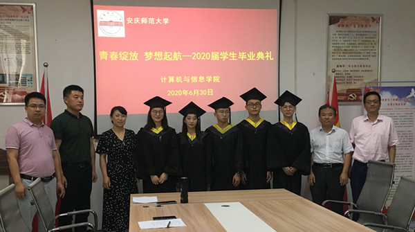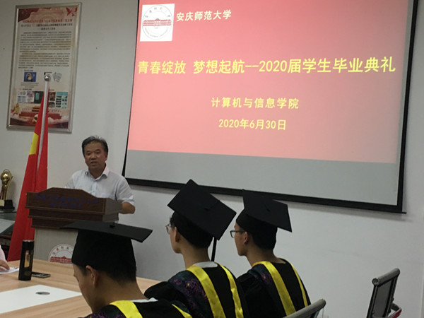 典礼在庄严的国歌声中拉开序幕。院长王一宾致辞,他首先代表学院对2020届毕业生取得的成绩表示了充分的肯定,对顺利完成学业的毕业生们表示了热烈祝贺,向为学生成长成才默默付出的老师们表示了衷心的感谢。他表示2020年是极其不平凡的一年,全国人民众志成城,共渡难关,因为疫情的原因学院只能以线上视频方式举行毕业典礼。临别之际,他对毕业生们寄予了殷切期望:希望他们常怀感恩之心,积极对待生活,做一个充满爱心之人;希望他们常怀进取之心,努力拼搏奋斗,做一个充满才学之人;希望他们常怀勤勉之心,认真履职尽责,做一个事业成功之人。最后,他深情地对全体毕业生说,“安庆师大永远是你们的坚强后盾,是你们的精神家园,希望大家紧抓互联网发展新机遇,勇敢迎接人生新挑战,在各自岗位上再创辉煌”。